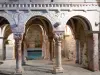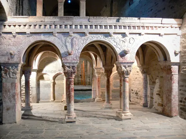 一度教会の中に入ると、鮮やかなピンクの大理石のスタンドに彫られた首都が上に立つ柱を賞賛します。後者は、花のモチーフ、天使や動物で飾られ、ルーシーのロマネスク様式の芸術の素晴らしい証言です...ロマネスク様式の彫刻のこの宝には別の宝石が飾られています。アーケードは美しい緑の設定で開きます。