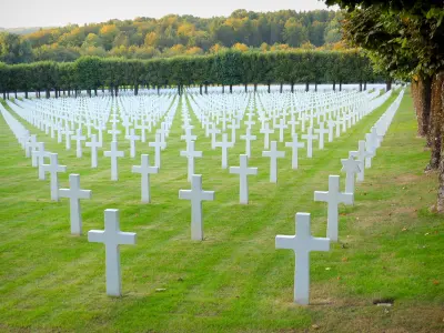 位于Verdun西北38公里处的Meuse的小村庄Romagne-sous-Montfaucon。该镇以东部最大的第一次世界大战美国公墓,第一次世界大战默兹 - 阿贡美国公墓和纪念馆而闻名,由两位美国建筑师设计,于1937年开放,全年开放。 在Meuse-Argonne攻势期间坠落的14,246名美国士兵被埋在52公顷的土地上。这个壮观的墓地场地位于一个极好的运动公园中间,由一个纪念馆和一个教堂组成,其中包含盟军国家的旗帜和代表美国分部盾牌的彩色眼镜。在其中一个纪念凉廊中,一个标志列出了所有身…
