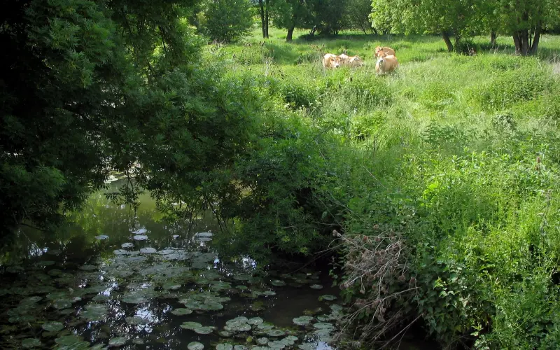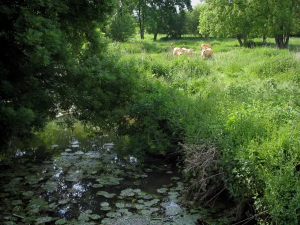 Rio com nenúfares, quatro vacas em um prado e árvores, no Parque Natural Regional Loire-Anjou-Touraine