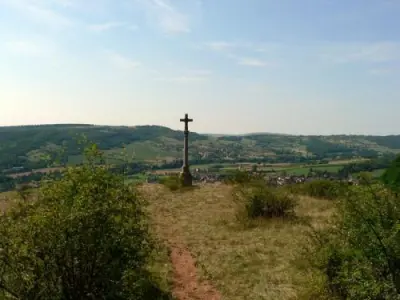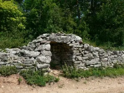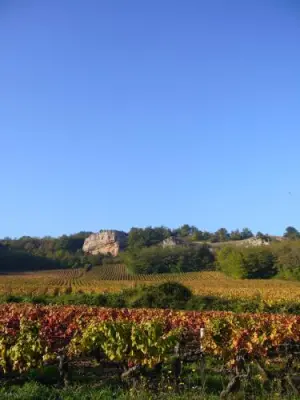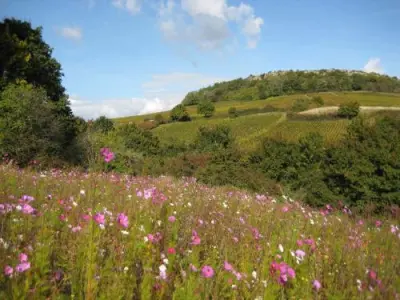 Una muy variada pie sobre una colina que domina el valle de Vaux ( Côte Chalonnaise ) : subir a los viñedos, punto de vista Theu, sendero botánico a través del bosque en la cima de la colina que lleva a un mirador, el descenso a una granja fortificada medieval, el retorno a través de la aldea de Saint- Jean -de - Vaux pasado una primavera, un lavadero y la piscina de verano.