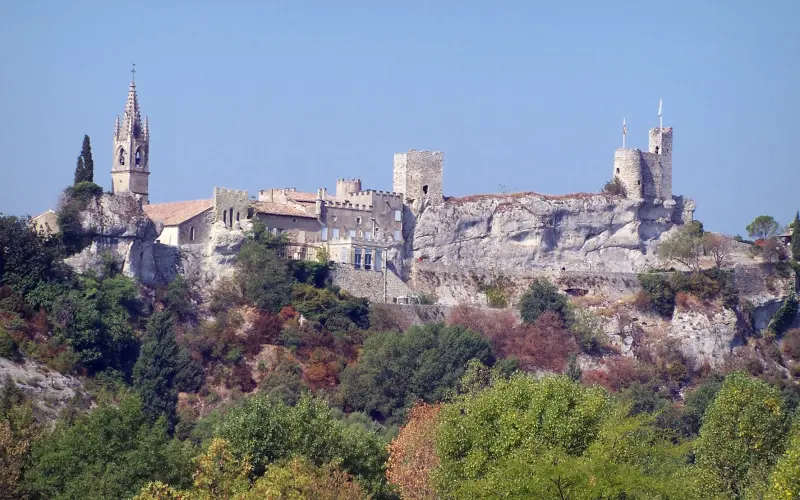 Aiguèze - Kirchturm der Kirche Saint-Roch, Türme und Bergfried (Schloß, Festung) des mittelalterlichen Dorfes, Bäume vorne