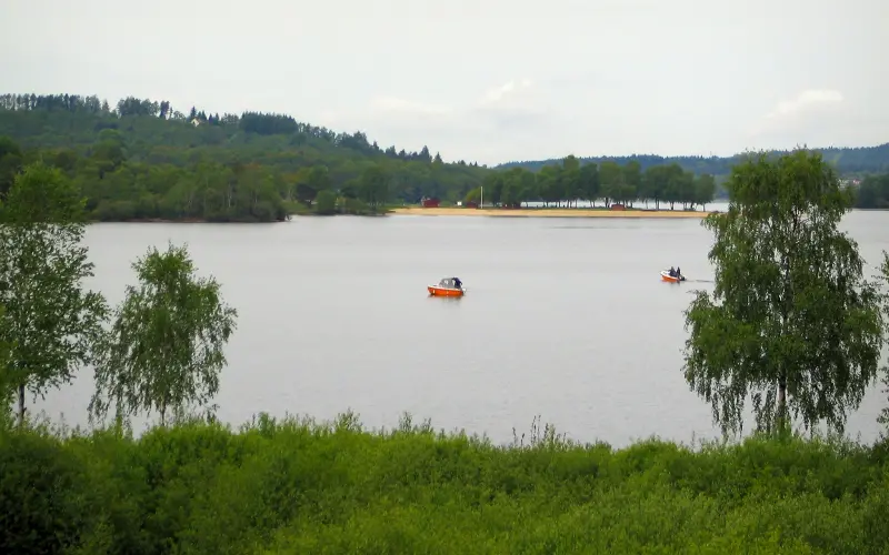 See von Vassivière - Stausee, Boote, Bäume und Wald