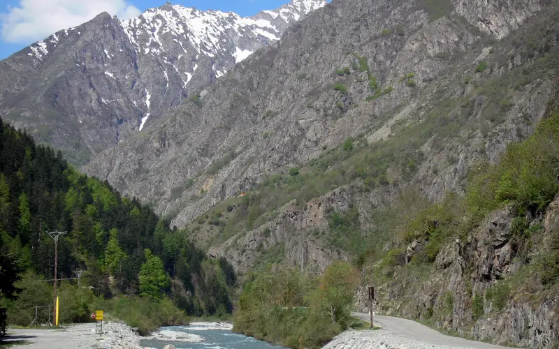 Tal des Valgaudemar: Wildbach Séveraisse, Bäume am Wasserrand und verschneite Berggipfel; im Nationalpark Ecrins (Ecrins Massiv)