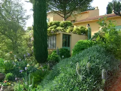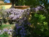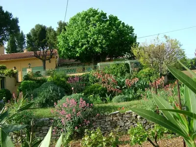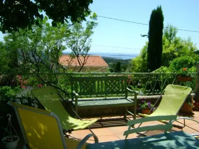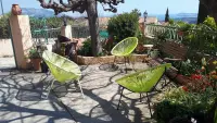 Villa classée Meublé de tourisme 4 etoiles dans le style provençal mitoyenne de plein pied, 5/6 personnes située, sur les hauteurs d Ollioules, vue mer dans un cadre provençal vignes, oliviers, lavandes, lauriers rose, à 10 minutes de Sanary. Terrain de 600 m² sur propriété sans vis à vis. Villa sécurisée par portail à code. 90 m² avec buanderie. Sejour et salle a manger avec cheminée, télé Samsung Led 102 cm neuve, chaine hifi, canapé lit à ouverture rapide, 2 chambres (1 lit de 140 et 2 lits d appoints, l autre avec lit en 140.) - Une grande cuisine aménagée, table cuisson avec gaz et induction, four neuf, lave vaisselle, hotte aspirante, nombreuse vaisselle. Salle d eau, wc et lave main séparé. Le tout en matériau du terroir et bien meublé. Buanderie avec lave-linge et planche à repasser, grande terrasse arborée avec une grande table, fauteuils, chaises, bains de soleil, chaises longue et blancs - Jardin 600 m² - Terrasse 100 m² - WIFI.