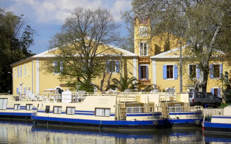 Port Canal du Midi, moored boats and facade of the hamlet of Somail