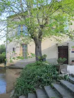 Port of the Canal du Midi, moored boats, trees and facades of the hamlet of Somail