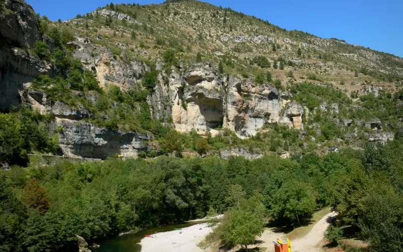 Cirque de Saint-Chély rock formations: beach, River Tarn lined width trees, and limestone cliffs overlooking the place; in the Cévennes National Park