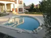 Nice little new farmhouse, 3 / 4 people, in property of 3500 m², between Avignon, Nîmes, Uzes, independent, not overlooked, in the middle of olive trees and vineyards, breathtaking views of the village. - Ground floor: kitchen, washing machine,…